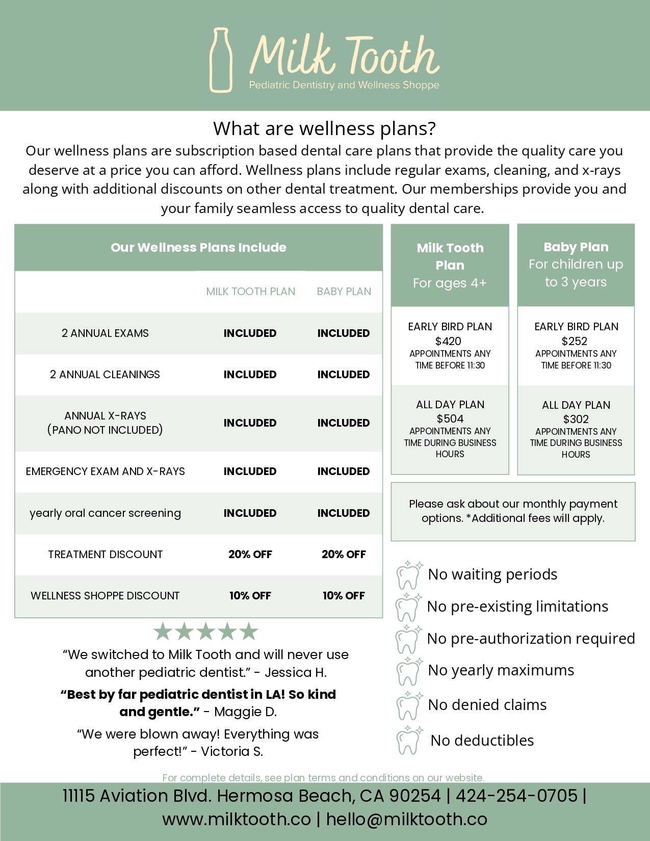 For patients who have an out of network plan or who do not have dental insurance we have created an affordable in house wellness memberships.